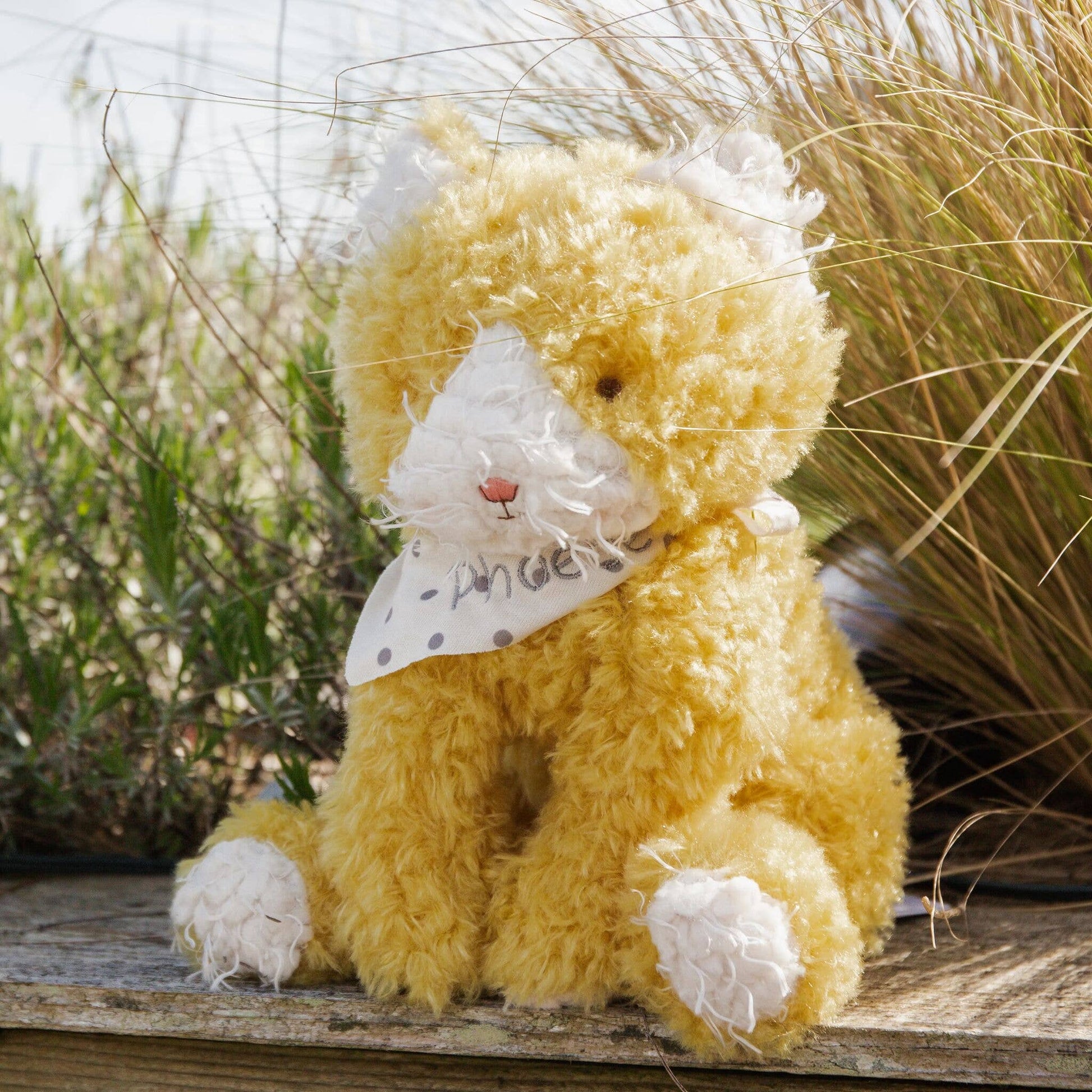 Features 14" extended, 9" sitting Embroidered features Safe for all ages 100% polyester Surface wash/Spot clean Pairs with Farm Friends- 100087: Moo Moo the Cow, 190208: Pepper the Farm Dog, 861101: Hammie, 861104: Clucky the Chicken, 104303: Randy the Rooster, 106070: Pony Boy Horse, 106071: Shep the Sheep, 106072: pairs with Who Says Peep Peep board book By popular demand, Alley is back on the farm. This adorable kitty cat stuffed animal has mustard yellow scruffy fur with a scraggly cream muzzle we all love. Embroidered face and stylish cream scarf with gray polka dots tied about her neck, make Alley Cat, the cutest little kitten around.