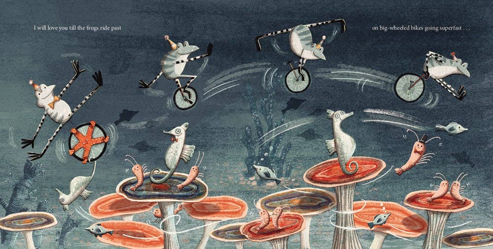 A perfect read-aloud for curling up with your little one at the end of the day . . . or anytime you want to express just how much you love them; this board book edition is just right for little hands! I will love you till the cows come home from a trip to Mars through skies unknown, in a rocket ship made of glass and stone. . . . I will love you till the cows come home. Love knows no bounds in this tender tribute to the depths of family love. For fans of Guess How Much I Love You—only funnier! This text extends the saying “I’ll love you till the cows come home” to the humorous extreme. Along the way there are yaks in Cadillacs, sheep setting sail, frogs on big-wheeled bikes, and more in this great read-aloud. At the end of the story, the author skillfully steps down the antics and finishes on the perfect bedtime note with everyone tucked up in bed.