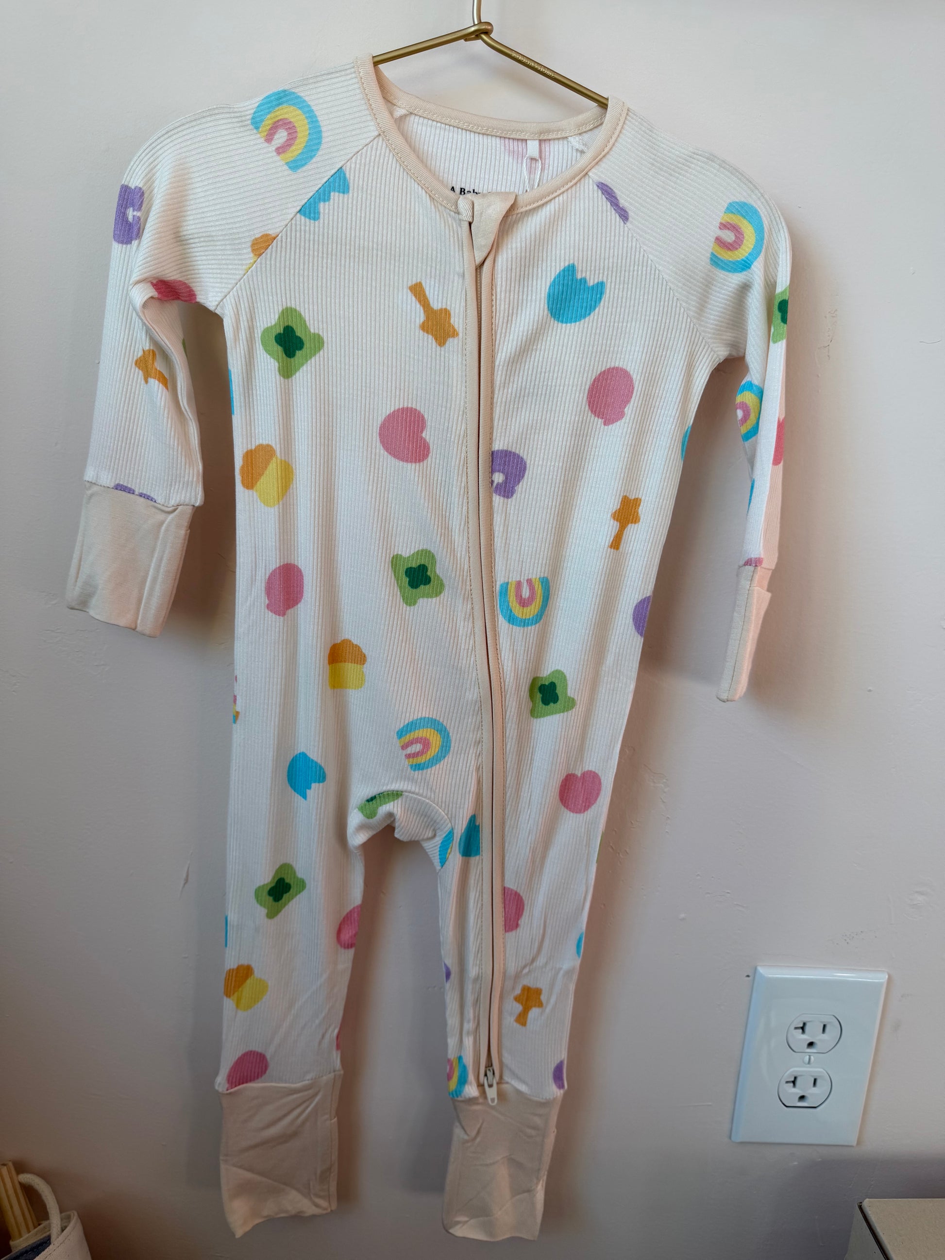 Sweet, playful, and made for everyday magic. The Lucky Charms Ribbed Bamboo Pajamas feature a soft cream base sprinkled with colorful charm-inspired icons—rainbows, hearts, clovers, and playful shapes—for a cheerful, gender-neutral look. Crafted from ultra-soft ribbed bamboo fabric, these zip-up pajamas are breathable, stretchy, and gentle on sensitive skin. Designed with fold-over cuffs for hands and feet, they grow with your little one and keep cozy day or night. A favorite for sleep, play, and all the cuddly moments in between.
