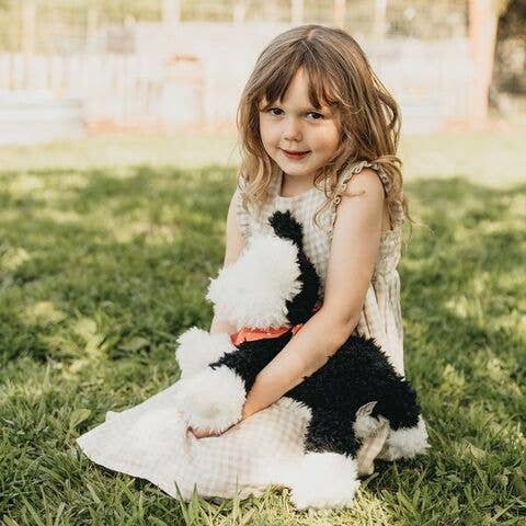 Features Size - 14” extended, 10 sitting Safe for all ages Embroidered details Scraggle and popcorn fur for great texture 100% polyester Surface wash/Spot clean Pairs with Farm Friends- 100087: Moo Moo the Cow, 861101: Hammie, 861104: Clucky the Chicken, 104302: Billy Goat, 104303: Randy the Rooster, 106070: Pony Boy Horse, 106071: Shep the Sheep, 106072: Alley Cat Meet Pepper the lovable Australian Shepard farm dog who's ready to play! With soft, plush black and white body with adorable floppy ears, Pepper is the perfect companion for you little one. This stuffed animal is made with high quality materials that are both durable and snuggly, and cute, embroidered face makes them even more loveable!