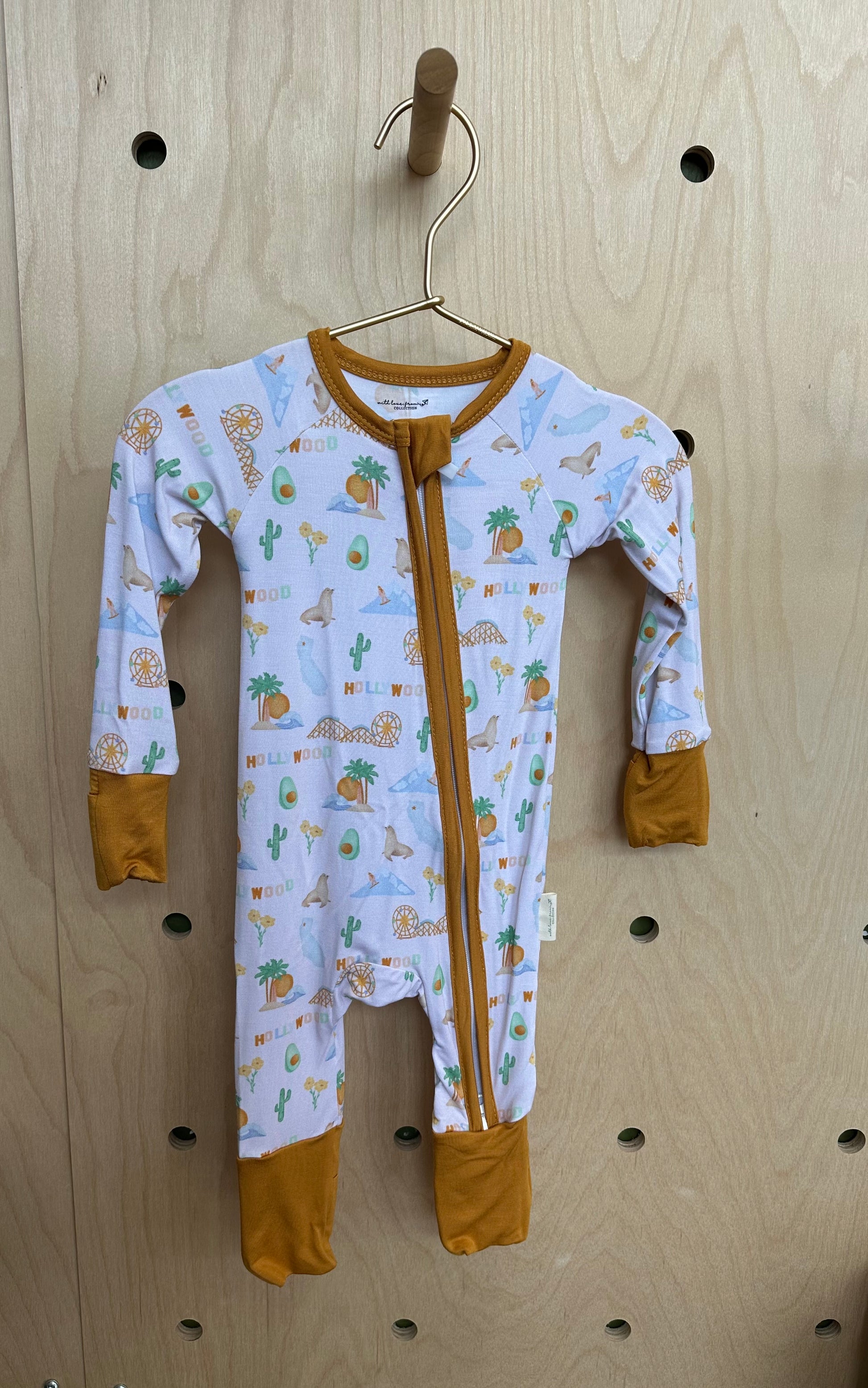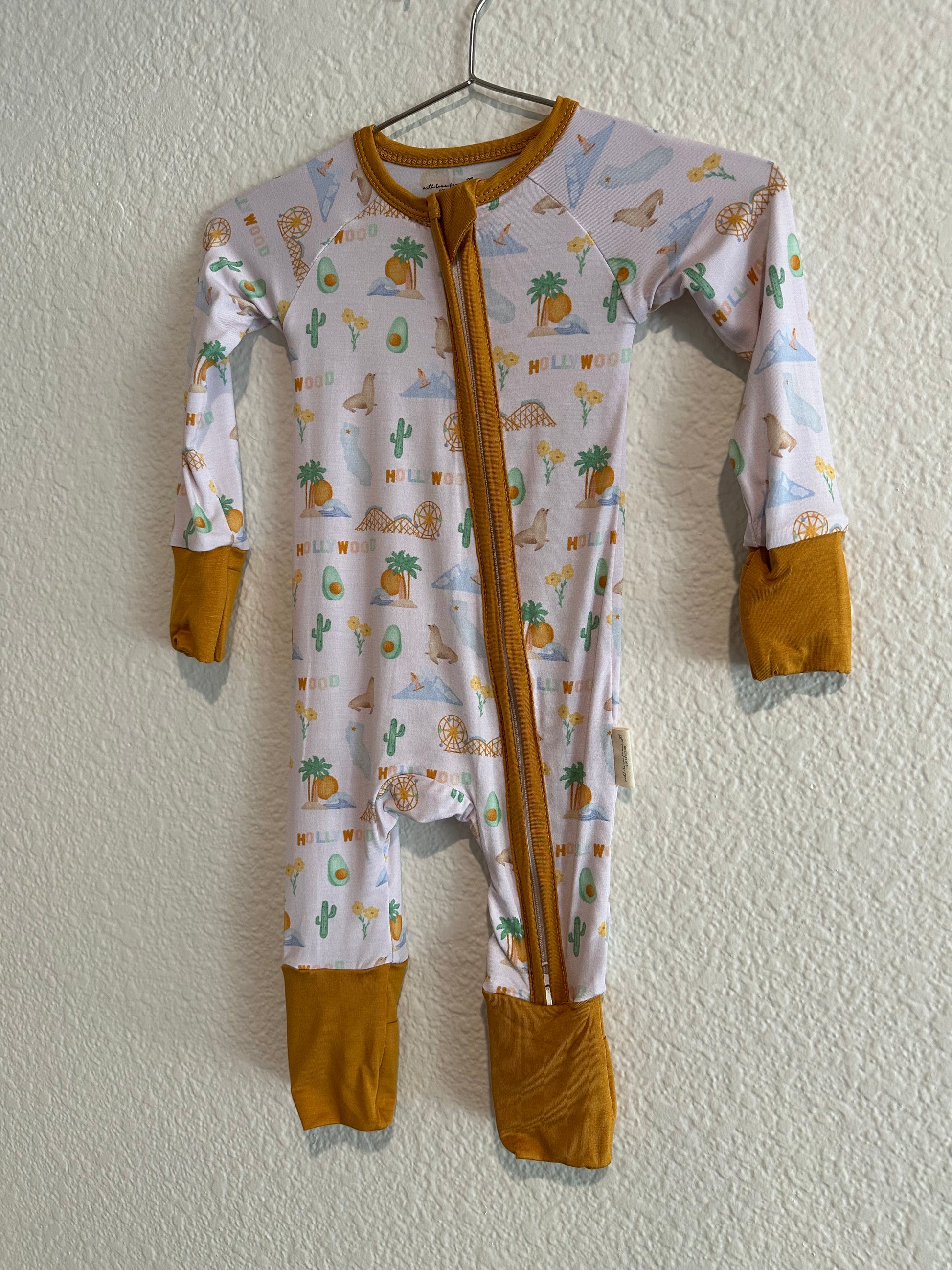 These bamboo zippy pajamas feature the outline of the Golden state, the state flower, a cactus, avocado and a seal. Additionally, we have incorporated other iconic symbols of the state, such as the iconic Hollywood sign, a rollercoaster, the beach and a snow capped mountain.