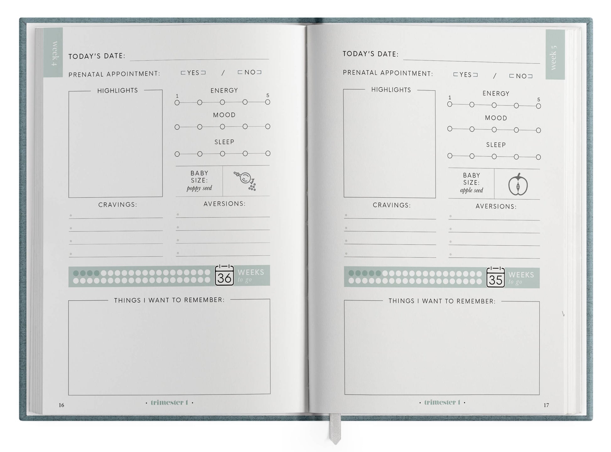 The Pregnancy Journal is more than a guided journal — it’s a calendar, a tracker, and an heirloom keepsake all rolled into one! It’s an absolute must have for expecting moms, expertly designed to help you get the most out of your pregnancy journey, both in the moment and for generations to come. Our incredibly easy-to-use design let’s you track weekly progress through all three trimesters, including your mood, energy level, sleep habits, highlights, cravings and more.